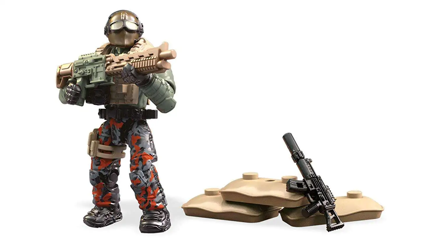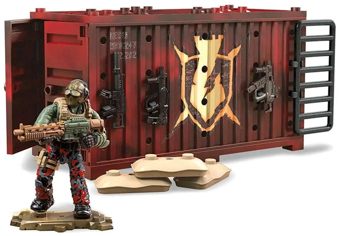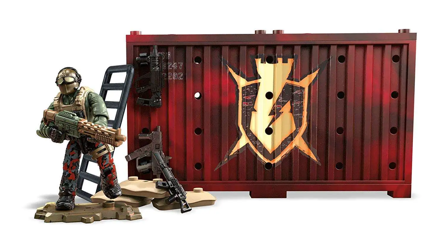 Stake your place with a mobile armory and modern infantry soldier! Used to haul military equipment, this shipping container pulls double duty as a buildable outpost when you open it to reveal an armory loaded with combat gear! Build the weapons rack outfit your infantry soldier for the modern battlefield! The collectible container features a deluxe printed detail inspired by the Call of Duty games. Collect and connect multiple armories together and build a sprawling battle complex!