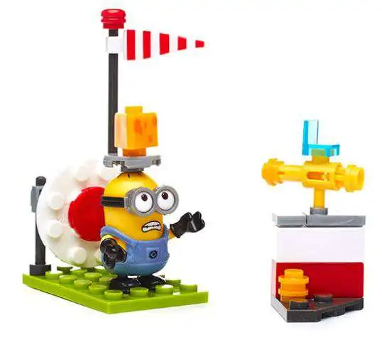 Come on down and try your luck at Freedonias Cheese Festival! Put a mischievous spin on a classic carnival game when you see how long the Minion tourist can hang on to the merry-go-round before getting thrown off! Build the merry-go-round, place this Minion on it, then use its flagpole to spin it round and round! Hang on tight!