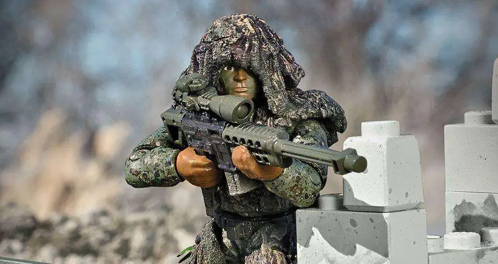Blending into even the most hostile environment undetected, the Ghillie Suit Sniper is an expert marksman and a member of the highly specialized Tactical Mission squad. A motion sensor to detect enemy movement helps ensure that the scene is recreated with striking authenticity. The Ghillie Suit Sniper also comes with a buildable base that includes ground cover, a highly detailed camouflage suit and a dedicated weapon.