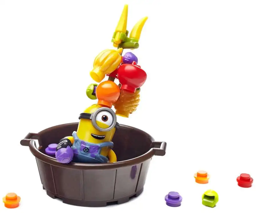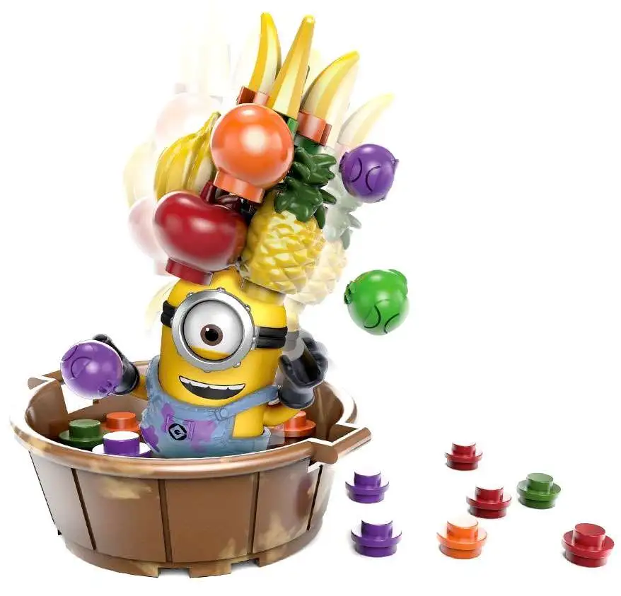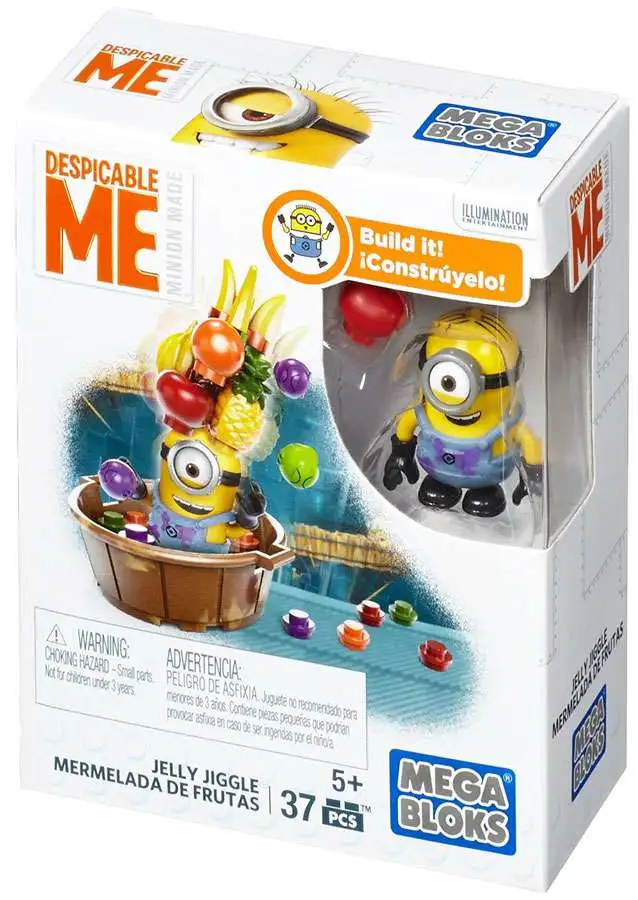 All the Minions at the jelly factory are supposed to be hard at work, stomping fruit into jelly. But when this Minion gets into his fruit vat, he just cant resist joking around and making the Jelly Jiggle by Mega Bloks Despicable Me! Build the jelly vat and put your buildable Minion on the spring to watch him shake and bounce all over! You can even make him a big, fully buildable fruit hat to wear as he works, so he can look like the silliest fruit stomper around!