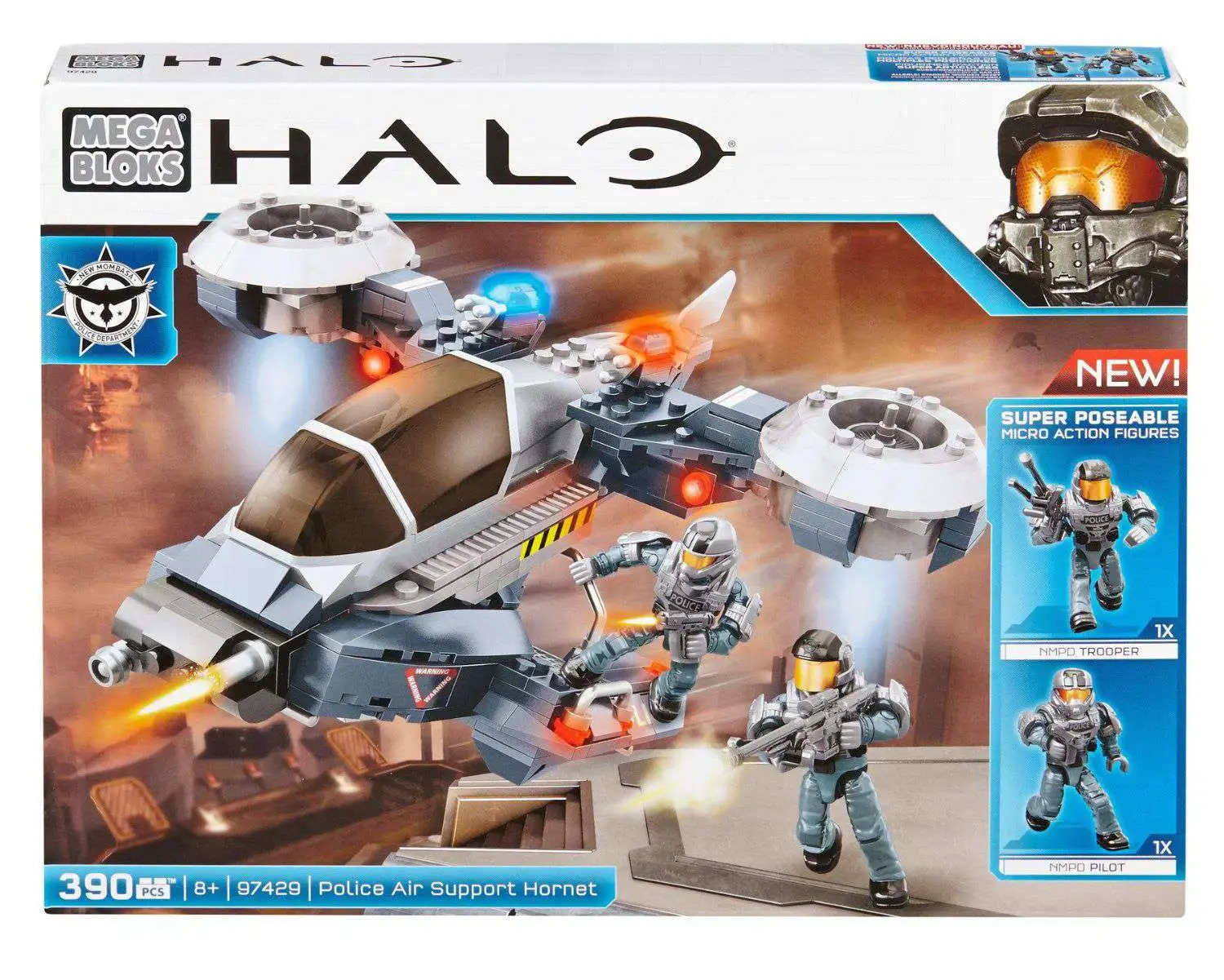 Fight crime and protect the citizens of New Mombasa with the new Police Air Support Hornet by Mega Bloks Halo! This fully buildable New Mombasa Police Department Hornet is a versatile aircraft with twin turbine engines and opening cockpit. Features two new super-articulated micro action figures with customizable armor. The NMPD Pilot and Trooper’s dual mission is to safeguard all of their citizens and combat Covenant invaders! Ideal for ages 8 and up!
