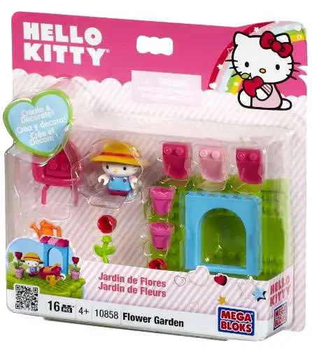 Hello Kitty gets to tend to her garden and plant all kinds of pretty flowers with the Hello Kitty Flower Garden buildable playset from Mega Bloks! Wearing her big gardening overalls, place Hello Kittys sun hat on her head, then grab her shovel and watering can and head on out to tend to her flowers! Move pots and plants around in the wheelbarrow, or have her and her friends admire her pretty roses in the shade of her awning!