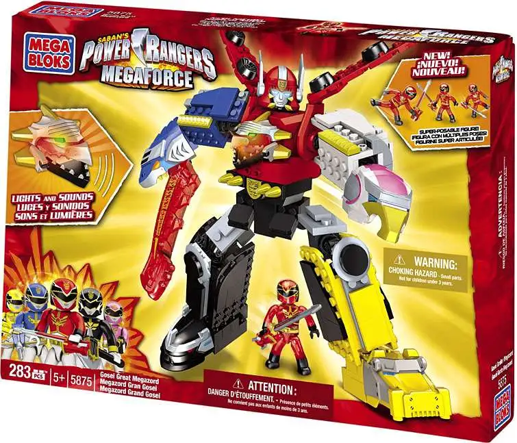 Call on the powers of the five Gosei Mechazords and build the Gosei Great Megazord by Mega Bloks! The Gosei Great Megazord is a completely buildable Megazord that has light-up blocks and real sounds! Rebuild the Gosei Great Megazord into four alternate builds. Pilot the Gosei Great Megazord with collectible Gosei Red Ranger and his Dragon sword, ready to face anything the Warstar aliens can throw at them!