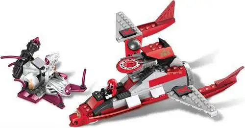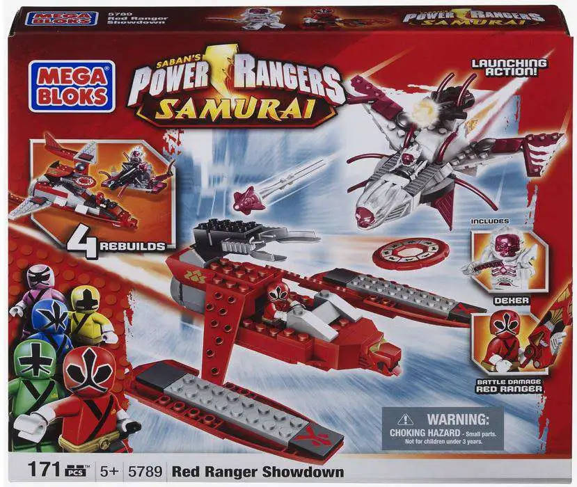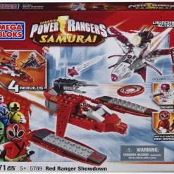 Prepare for the ultimate Ranger versus Nighlok battle as Deker and the Red Ranger square off in a one-on-one duel with the Red Ranger Showdown by Mega Bloks! Deker flies over the city in his Nighlok fighter and fires its real-working missile launcher at the Red Ranger in his Red Samurai Hydrofoil! Red Ranger returns fire with its spin-disc launcher, forcing Deker to land and attack using the powerful Uramasa! Red Ranger fearlessly meets Deker blade-to-blade in battle damaged armor with his Fire Smasher!