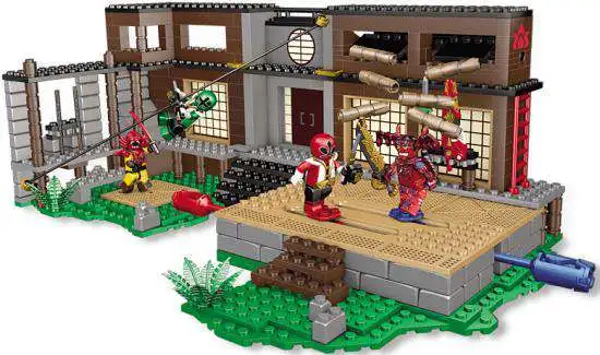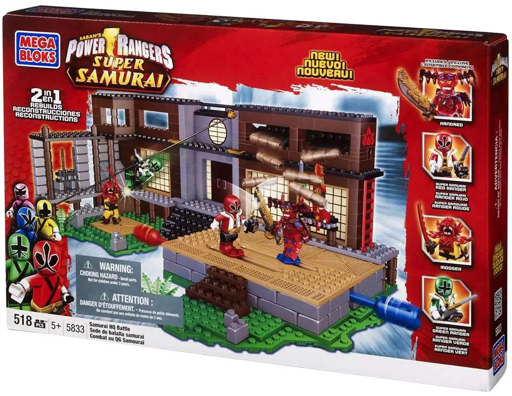 The Shiba House is under attack! Build and battle with the Samurai HQ Battle set by Mega Bloks. This action-packed set includes Super Samurai Mode Red and Blue Rangers, a Mooger, and an exclusive translucent Xandred the leader of the Nighloks! Falling logs and a suspended stunt rope add stunts and action to the battle. Attach your figures to the battle plates and face off against a friend to determine the fate of the Shiba House!