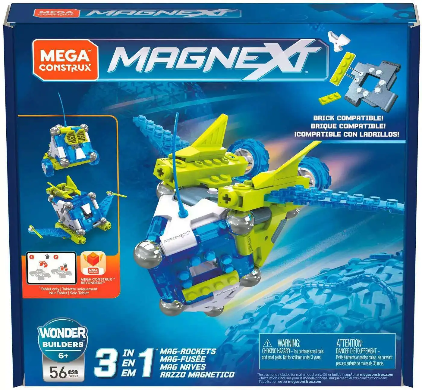 Blast off and defy gravity with a rebuildable magnetic space cruiser! Gravitate towards the stars! Build different spacecrafts with the Magnext 3-in-1 Mag-Rockets! Magnext features innovative panels and an interlocking construction system so you can build with bricks and magnets. Tough and sturdy, this space cruiser can withstand even the trickiest, densest asteroid belts. Download the Mega Construx Beyonders app to rebuild Space buggy into various space-hopping vehicles like Swooper or Fly-by. The power of magnetism is yours to play with! Ideal for ages 6 and up
