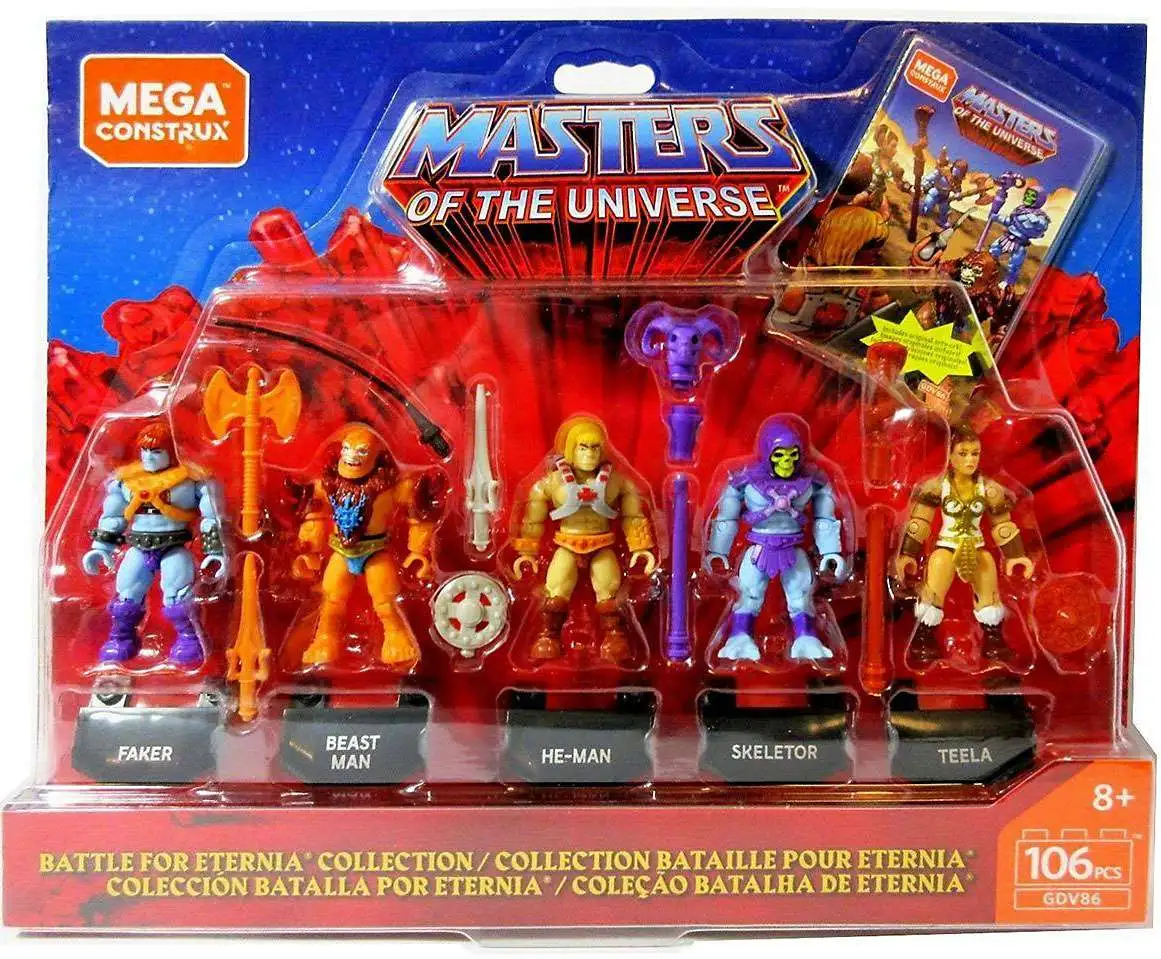 From Masters of the Universe comes these detailed Mega Construx MCX Heroes Mini-Figures! The Masters of the Universe MCX Heroes Collector’s Edition Mini-Figure 5-Pack contains 5 original characters: He-Man, Skeletor, Teela, Faker, and Beast Man. Each 2-inch tall super-poseable figure features up to 13 points of articulation, comes with authentic weapons and accessories, and includes a color-coded display stand. The Masters of the Universe MCX Heroes Collector’s Edition Mini-Figure 5-Pack comes in blister card packaging.