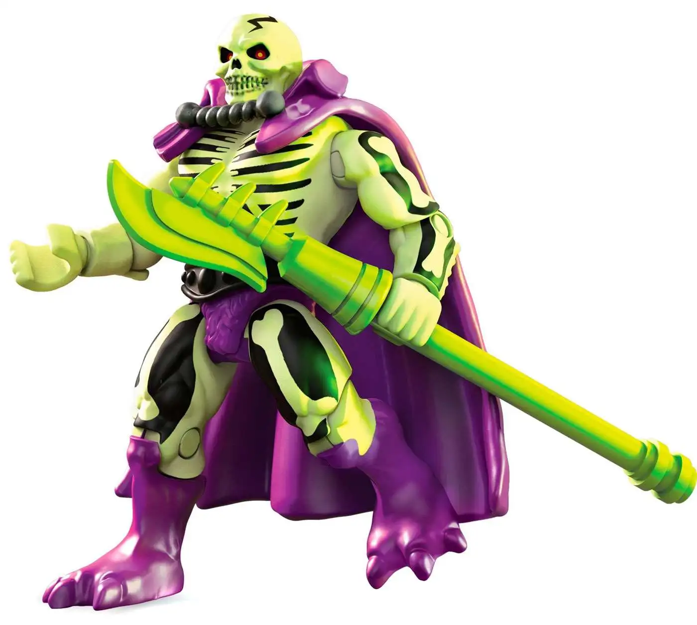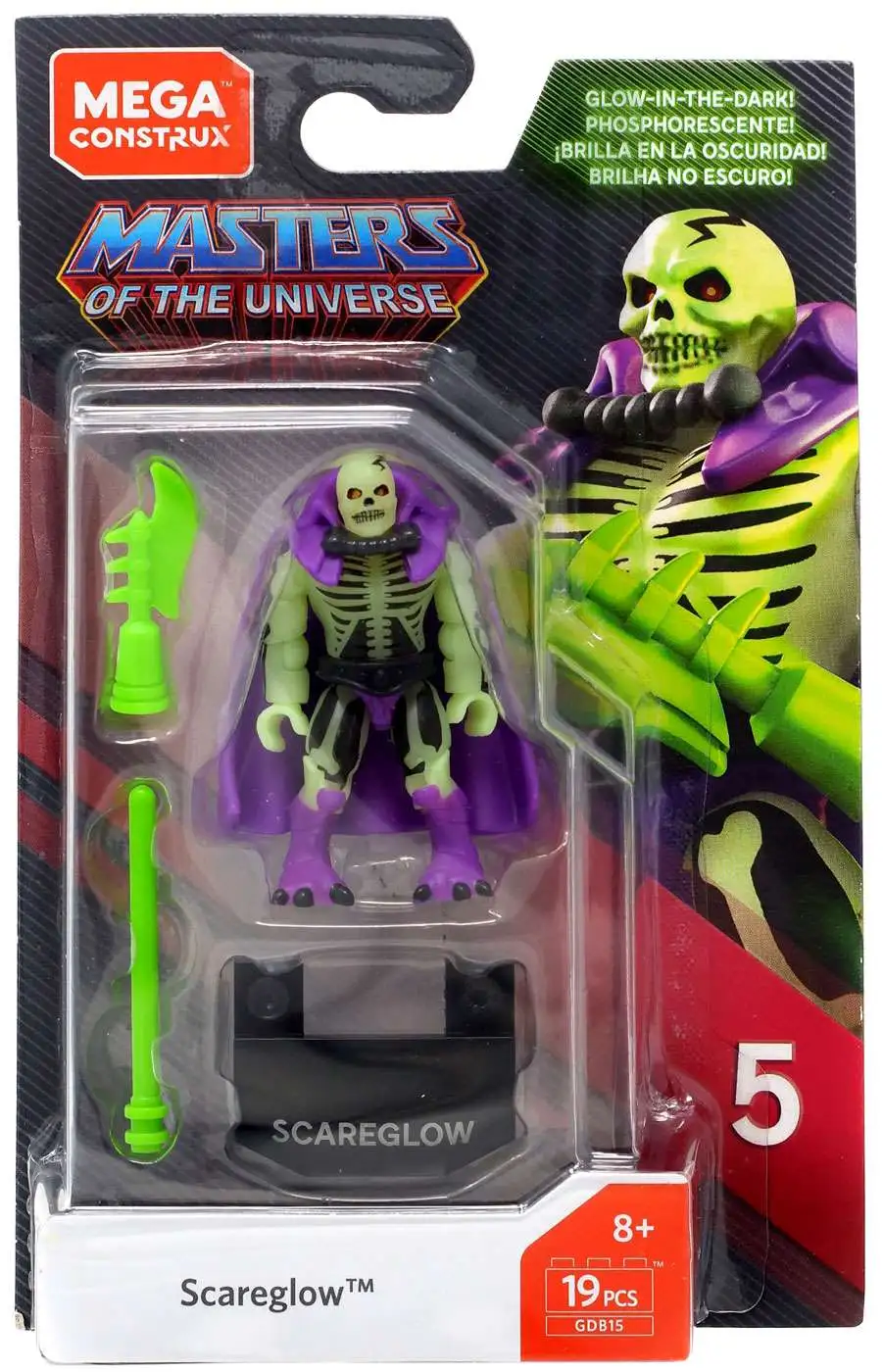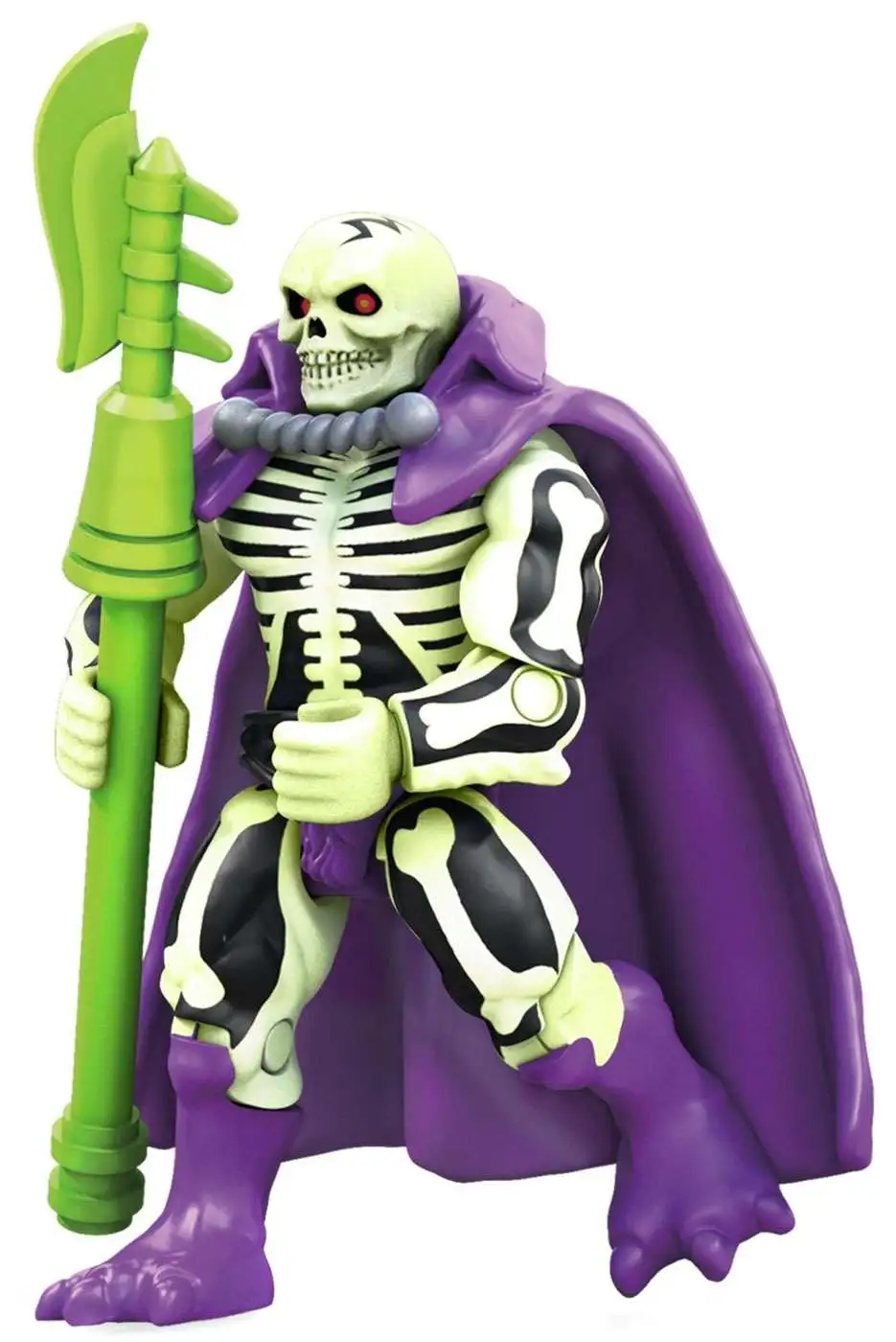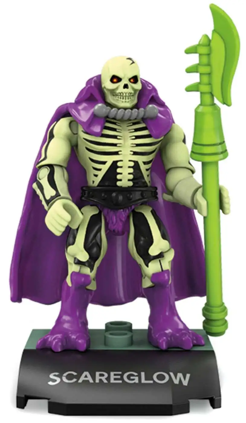Haunt Eternia forever! Scare up some evil with the skeletal ghost warrior when you build your own collectible Scareglow micro action figure, complete with deluxe details and premium printed decoration. This super-poseable figure comes with authentic cape and Scythe of Doom, as well as a buildable stand with printed name detail for the ultimate display. Build and collect all 6 in the series!