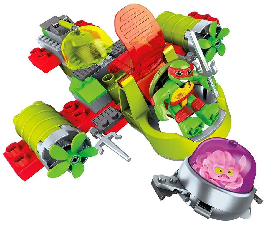 Launch an aerial attack in a Turtle-Powered jet and blast away at a Kraang Floater! When a Kraang takes flight to escape, little Turtles fans can take the action to new heights! Build the Turtle Jet Blaster, then fold Raph into a ball and sit him in the cockpit the all-new Turtle launcher! Then, hit the trigger to launch Raph into the air, blasting him into the Kraang Floater, to knock Kraang out of it. With Kraang exposed on the ground, roll the Raph ninja ball at Kraang to stun and trap him in the Jet’s holding dome. You’re grounded, Kraang! For ages 3 and up.