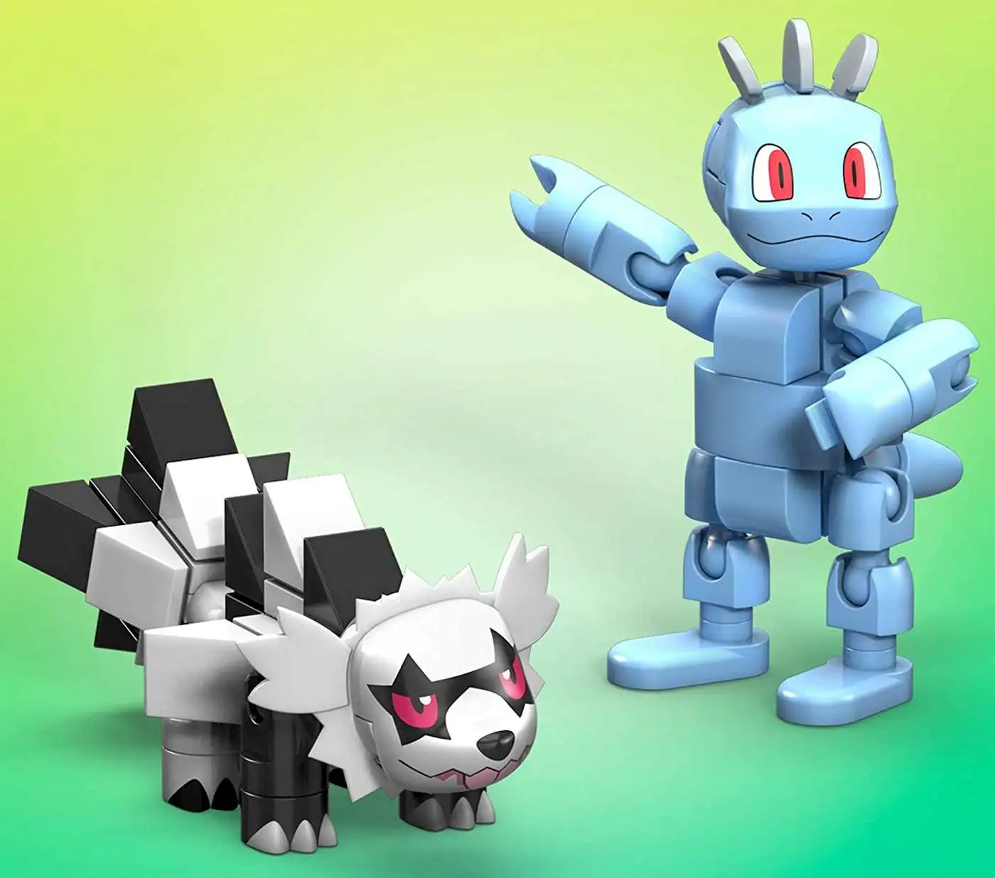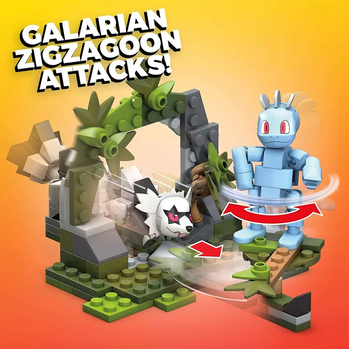 Create your own epic battles with a construction set made just for Machop and Galarian Zigzagoon. Build a cavernous environment for Galarian Zigzagoon to hide inside, then place Machop outside of the cavern. Pull the lever to make Galarian Zigzagoon pop out of the cavern and scare away Machop. Push the lever to return both characters to their original position. Ideal for Wonder Builders, ages 6 and up
