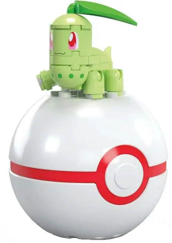 Buildable and poseable Chikorita figure building set with pronged Nest Ball for figure display